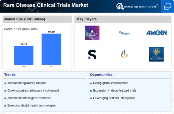 The Rare Disease Clinical Trials Market is characterized by a dynamic competitive landscape, driven by the increasing prevalence of rare diseases and the growing demand for innovative therapies. Key players such as Vertex Pharmaceuticals (US), Biogen (US), and Novartis (CH) are strategically positioned to leverage their extensive research capabilities and robust pipelines. Vertex Pharmaceuticals (US) focuses on developing transformative therapies for cystic fibrosis, while Biogen (US) emphasizes its commitment to neurological disorders, particularly in rare forms of amyotrophic lateral sclerosis (ALS). Novartis (CH) is actively pursuing gene therapies, indicating a shift towards personalized medicine. Collectively, these strategies foster a competitive environment that prioritizes innovation and patient-centric solutions.In terms of business tactics, companies are increasingly localizing manufacturing and optimizing supply chains to enhance efficiency and responsiveness. The market appears moderately fragmented, with a mix of established pharmaceutical giants and emerging biotech firms. The collective influence of these key players shapes the market structure, as they engage in strategic collaborations and partnerships to bolster their research and development efforts.