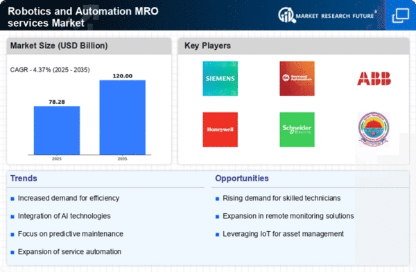 The Robotics and Automation MRO services Market is characterized by a dynamic competitive landscape, driven by technological advancements and increasing demand for automation across various industries. Key players such as Siemens (DE), Rockwell Automation (US), and ABB (CH) are at the forefront, each adopting distinct strategies to enhance their market positioning. Siemens (DE) emphasizes innovation through substantial investments in R&D, focusing on digital solutions that integrate AI and IoT into maintenance processes. Rockwell Automation (US) has pursued strategic partnerships to bolster its service offerings, particularly in the realm of cybersecurity for industrial automation. Meanwhile, ABB (CH) is concentrating on sustainability initiatives, aligning its operations with global environmental standards, which appears to resonate well with clients seeking eco-friendly solutions.The market structure is moderately fragmented, with numerous players vying for market share. Key tactics employed by these companies include localizing manufacturing to reduce costs and optimize supply chains, which is crucial in maintaining competitive pricing. The collective influence of these major players shapes the market dynamics, as they continuously adapt to emerging trends and customer demands, thereby fostering a competitive yet collaborative environment.