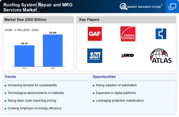 The Roofing System Repair and MRO Services Market is characterized by a competitive landscape that is increasingly shaped by innovation, sustainability, and strategic partnerships. Key players such as GAF (US), Owens Corning (US), and Sika AG (CH) are actively pursuing strategies that emphasize technological advancements and eco-friendly solutions. GAF (US) has positioned itself as a leader in roofing technology, focusing on the development of energy-efficient materials, while Owens Corning (US) has been enhancing its product portfolio through strategic acquisitions and partnerships aimed at expanding its market reach. Sika AG (CH), on the other hand, is leveraging its expertise in construction chemicals to innovate in roofing solutions, thereby enhancing its competitive edge in the market.The business tactics employed by these companies reflect a trend towards localizing manufacturing and optimizing supply chains to enhance operational efficiency. The market appears moderately fragmented, with a mix of established players and emerging companies vying for market share. The collective influence of these key players is significant, as they not only drive innovation but also set industry standards that smaller competitors often follow.