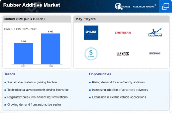 The Rubber Additive Market is benefiting from technological innovations in rubber processing techniques. Advances in manufacturing processes, such as improved mixing and curing technologies, are enhancing the efficiency and effectiveness of rubber production. These innovations allow for the incorporation of advanced additives that improve the performance characteristics of rubber products. In 2025, the adoption of new technologies is anticipated to boost the demand for specialized rubber additives, as manufacturers strive to optimize their production processes. This trend suggests a dynamic shift in the rubber additive market, where technology plays a pivotal role in shaping product offerings and enhancing competitiveness.