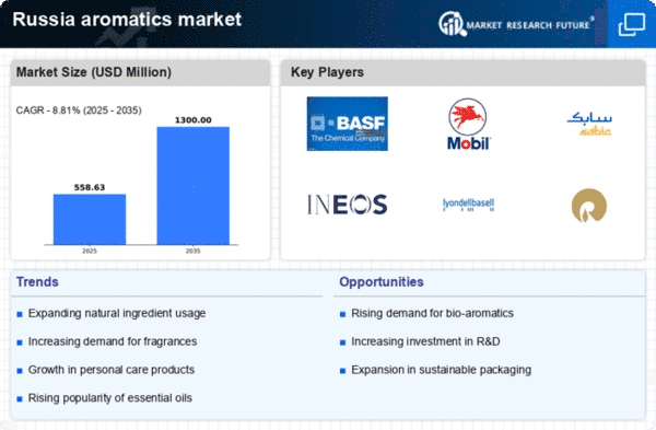 The aromatics market in Russia is characterized by a competitive landscape that is increasingly shaped by innovation, sustainability, and strategic partnerships. Key players such as BASF SE (Germany), ExxonMobil Chemical (US), and SABIC (Saudi Arabia) are actively pursuing strategies that emphasize technological advancements and regional expansion. BASF SE (Germany), for instance, focuses on enhancing its product portfolio through sustainable practices, which aligns with the growing demand for eco-friendly solutions. ExxonMobil Chemical (US) appears to be concentrating on optimizing its supply chain to improve efficiency and reduce costs, while SABIC (Saudi Arabia) is likely leveraging its strong market presence to forge strategic alliances that enhance its competitive edge.The business tactics employed by these companies reflect a moderately fragmented market structure, where local manufacturing and supply chain optimization are pivotal. The collective influence of these key players suggests a dynamic interplay of strategies that not only drive competition but also foster innovation within the sector. As companies localize their operations, they are better positioned to respond to regional market demands, thereby enhancing their competitive stance.