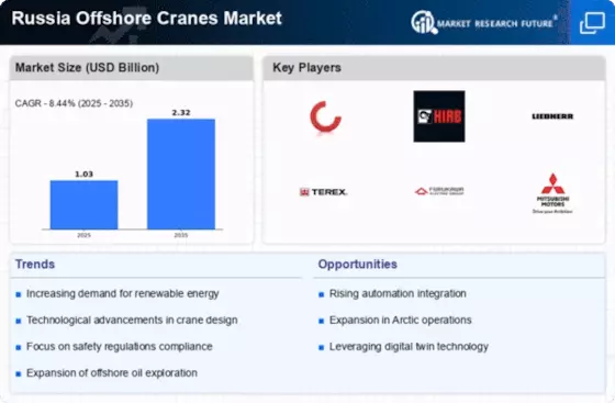 Regulatory support for offshore operations in Russia is a crucial driver for the Offshore Cranes Market. The government has implemented various policies aimed at enhancing safety and operational efficiency in offshore activities. These regulations often mandate the use of advanced lifting equipment, thereby increasing the demand for offshore cranes. Additionally, the Russian Maritime Register of Shipping has established guidelines that promote the adoption of modern crane technologies. As compliance with these regulations becomes essential for operators, the demand for high-quality offshore cranes is expected to rise, further propelling the growth of the Russia Offshore Cranes Market.