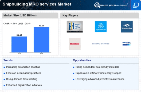 The Shipbuilding MRO services Market is characterized by a dynamic competitive landscape, driven by technological advancements, increasing defense budgets, and a growing emphasis on sustainability. Key players such as Huntington Ingalls Industries (US), Thyssenkrupp Marine Systems (DE), and BAE Systems (GB) are strategically positioned to leverage these trends. Huntington Ingalls Industries (US) focuses on innovation in ship maintenance technologies, while Thyssenkrupp Marine Systems (DE) emphasizes regional expansion and partnerships to enhance its service offerings. BAE Systems (GB) is actively pursuing digital transformation initiatives to streamline operations and improve service delivery. Collectively, these strategies contribute to a competitive environment that is increasingly focused on technological differentiation and operational efficiency.In terms of business tactics, companies are localizing manufacturing and optimizing supply chains to enhance responsiveness and reduce costs. The market appears moderately fragmented, with several key players exerting influence over specific segments. This fragmentation allows for niche players to thrive, while larger companies consolidate their positions through strategic acquisitions and partnerships, thereby shaping the overall market structure.