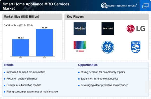 The Smart Home Appliance MRO Services Market is currently characterized by a dynamic competitive landscape, driven by rapid technological advancements and increasing consumer demand for smart home solutions. Key players such as Whirlpool (US), Samsung (KR), and LG Electronics (KR) are strategically positioning themselves through innovation and digital transformation. These companies are not only enhancing their service offerings but are also focusing on sustainability and energy efficiency, which are becoming critical factors for consumers. The collective strategies of these firms contribute to a moderately fragmented market structure, where competition is intensifying as companies seek to differentiate themselves through superior service and technological integration.In terms of business tactics, companies are increasingly localizing manufacturing and optimizing their supply chains to enhance responsiveness to market demands. This approach allows for quicker service delivery and reduced operational costs, which are essential in the competitive MRO landscape. The market structure remains moderately fragmented, with several key players exerting influence, yet the presence of numerous smaller firms adds complexity to the competitive dynamics. The interplay between these larger entities and smaller competitors fosters an environment ripe for innovation and service diversification.