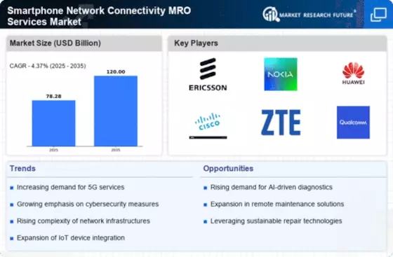 The Smartphone Network Connectivity MRO Services Market is characterized by a dynamic competitive landscape, driven by rapid technological advancements and increasing demand for seamless connectivity. Key players such as Ericsson (SE), Nokia (FI), and Huawei (CN) are at the forefront, each adopting distinct strategies to enhance their market positioning. Ericsson (SE) focuses on innovation and digital transformation, investing heavily in 5G technology and network automation, which positions it as a leader in providing advanced MRO services. Meanwhile, Nokia (FI) emphasizes strategic partnerships and regional expansion, particularly in emerging markets, to bolster its service offerings and customer base. Huawei (CN), on the other hand, leverages its extensive R&D capabilities to deliver cutting-edge solutions, thereby enhancing its competitive edge in the global arena.The market structure appears moderately fragmented, with a mix of established players and emerging companies vying for market share. Key business tactics such as localizing manufacturing and optimizing supply chains are prevalent among these companies, allowing them to respond swiftly to market demands and reduce operational costs. The collective influence of these major players shapes the competitive environment, fostering an atmosphere of innovation and collaboration.