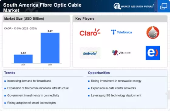 The South America Fibre Optic Cable Market is being propelled by the emergence of smart technologies that necessitate high-speed data transmission. The proliferation of Internet of Things (IoT) devices and smart city initiatives across the region is creating a substantial demand for advanced fiber optic networks. Countries like Brazil and Chile are investing in smart infrastructure, including smart grids and intelligent transportation systems, which rely heavily on fiber optics for efficient data communication. This trend indicates a growing recognition of the importance of fiber optic technology in supporting innovative solutions and enhancing urban living standards. Consequently, the integration of smart technologies is expected to significantly influence the growth trajectory of the South America Fibre Optic Cable Market.