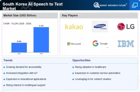The South Korea AI Speech to Text Market is experiencing a notable surge in demand for accessibility solutions. This trend is largely driven by the increasing awareness of the need for inclusivity among individuals with disabilities. Organizations and educational institutions are actively seeking AI-driven speech recognition technologies to enhance communication for the hearing impaired. According to recent statistics, approximately 3.5 million people in South Korea have some form of hearing impairment, creating a substantial market for speech-to-text applications. This growing demand is prompting developers to innovate and refine their offerings, ensuring that the South Korea AI Speech to Text Market remains competitive and responsive to the needs of diverse user groups.
