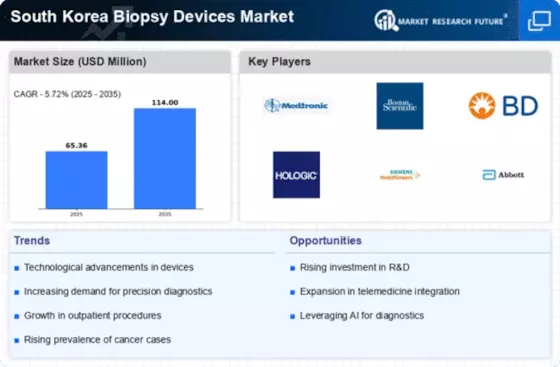 The South Korea Biopsy Devices Market is experiencing a notable transformation due to rapid technological advancements. Innovations such as automated biopsy systems and image-guided biopsy techniques are enhancing the precision and efficiency of procedures. For instance, the integration of artificial intelligence in imaging systems is likely to improve diagnostic accuracy, thereby increasing the demand for advanced biopsy devices. Furthermore, the introduction of minimally invasive techniques is expected to reduce patient recovery time, which may lead to higher adoption rates among healthcare providers. As a result, the market is projected to grow significantly, with estimates suggesting a compound annual growth rate (CAGR) of around 8% over the next five years. This trend indicates a robust future for the South Korea Biopsy Devices Market, driven by continuous innovation and improved patient outcomes.
