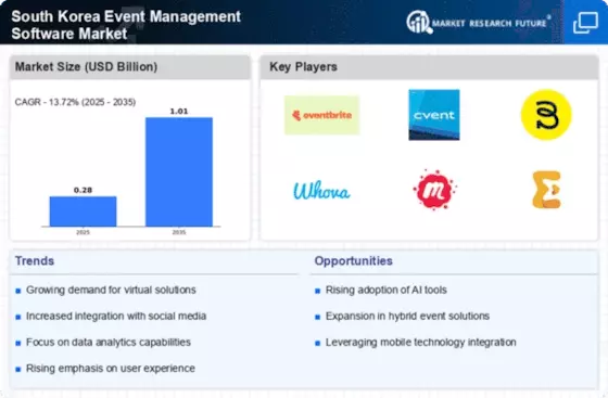 The South Korea Event Management Software Market is experiencing a notable increase in demand for virtual events. This trend is driven by the growing preference for online platforms that facilitate remote participation. As organizations seek to engage wider audiences, the software solutions that support virtual events are becoming essential. According to recent data, the virtual event segment is projected to grow at a compound annual growth rate of over 20% in the next few years. This growth indicates a shift in how events are conceptualized and executed, with software providers adapting their offerings to meet these evolving needs. The South Korea Event Management Software Market is thus witnessing a transformation, where flexibility and accessibility are prioritized, allowing event organizers to reach participants beyond geographical limitations.