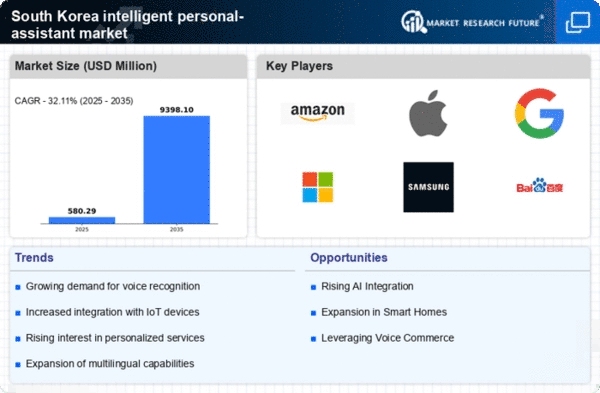 The intelligent personal-assistant market is significantly influenced by the increasing demand for smart home integration in South Korea. As households adopt smart devices, the need for personal assistants that can control and manage these devices has surged. In 2025, it is estimated that over 60% of households in South Korea will have at least one smart home device, creating a substantial opportunity for personal assistants to serve as central control hubs. This trend is likely to drive market growth, with projections indicating a market size of approximately $1.4 billion by 2025. The ability of personal assistants to interact with various smart home technologies enhances user convenience and promotes energy efficiency, making them indispensable in modern households. As consumers continue to embrace smart living, the intelligent personal-assistant market is expected to thrive.
