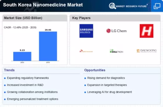 The South Korea Nanomedicine Market is benefiting from significant advancements in diagnostic technologies. Innovations in nanotechnology are enabling the development of highly sensitive diagnostic tools that can detect diseases at an early stage. For instance, nanomaterials are being utilized to create biosensors that provide rapid and accurate results. This is particularly relevant in the context of personalized medicine, where early diagnosis is crucial for tailoring effective treatment plans. The integration of nanotechnology in diagnostics not only enhances patient outcomes but also aligns with the broader goals of the South Korean healthcare system to improve efficiency and reduce costs. As these technologies continue to evolve, they are likely to play a pivotal role in the growth of the nanomedicine market.