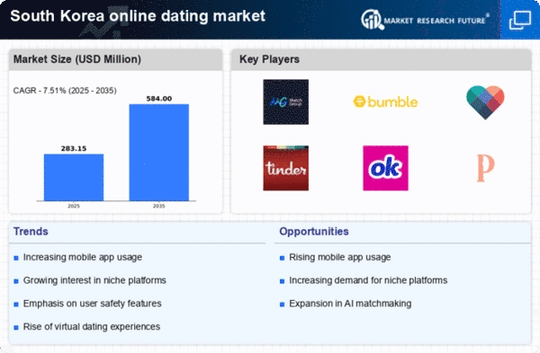 The online dating market in South Korea is experiencing a notable transformation due to advancements in communication technologies. The proliferation of smartphones and high-speed internet access has facilitated seamless interactions between users. As of 2025, approximately 95% of the population utilizes smartphones, enabling easy access to dating platforms. This technological shift has led to an increase in user engagement, with many platforms reporting a 30% rise in daily active users. Furthermore, features such as video calls and instant messaging have become standard, enhancing user experience and satisfaction. The integration of artificial intelligence in matchmaking algorithms also appears to improve compatibility, making the online dating market more appealing to a broader audience. Consequently, these technological advancements are likely to drive growth and innovation within the industry.