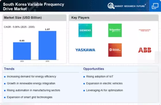 Technological advancements in automation are significantly influencing the South Korea Variable Frequency Drive Market. The integration of advanced control algorithms and digital technologies in VFDs enhances their performance and functionality. For instance, the incorporation of IoT capabilities allows for real-time monitoring and predictive maintenance, which can lead to increased operational efficiency. The South Korean manufacturing sector, which is heavily reliant on automation, is expected to adopt these advanced VFDs to streamline processes and reduce downtime. As industries continue to embrace Industry 4.0, the demand for sophisticated VFD solutions is likely to rise, further propelling the growth of the market.