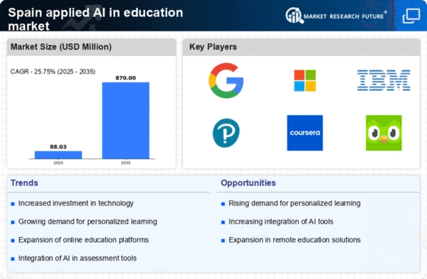 The integration of AI technologies into educational curricula is a pivotal driver for the applied ai-in-education market. Educational institutions in Spain are increasingly adopting AI tools to enhance learning experiences. This integration allows for personalized learning paths, catering to individual student needs. According to recent data, approximately 35% of educational institutions in Spain have implemented AI-driven tools in their curricula. This trend is likely to continue as schools seek to improve student engagement and outcomes. the applied AI in education market is experiencing growth as more institutions recognize the benefits of AI in fostering a more adaptive learning environment..