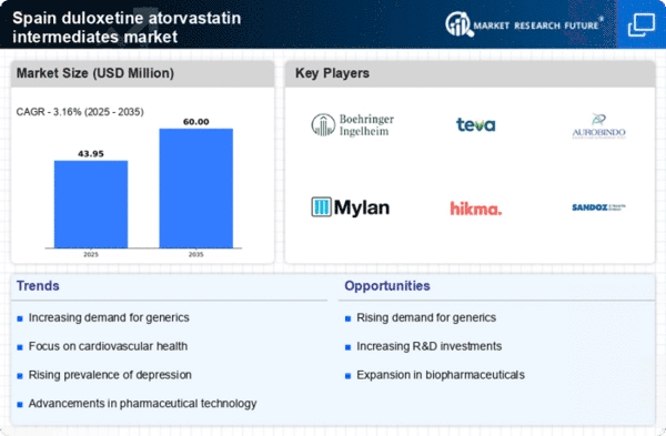 The rising healthcare expenditure in Spain is a pivotal driver for the duloxetine atorvastatin-intermediates market. As the government allocates more funds towards healthcare, the demand for pharmaceuticals, including intermediates, is likely to increase. In 2025, healthcare spending in Spain is projected to reach approximately €200 billion, reflecting a growth of around 5% from previous years. This increase in budget allows for enhanced research and development activities, which are crucial for the production of high-quality intermediates. Furthermore, as healthcare costs rise, there is a growing emphasis on effective treatment options, which could lead to a higher consumption of duloxetine and atorvastatin, thereby boosting the intermediates market. The interplay between healthcare funding and pharmaceutical demand suggests a robust growth trajectory for the duloxetine atorvastatin-intermediates market in Spain.