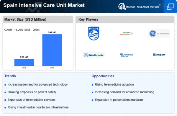 Government initiatives aimed at enhancing healthcare infrastructure in Spain are significantly influencing the intensive care-unit market. The Spanish government has allocated substantial funding to improve hospital facilities and expand intensive care capabilities. Recent budgets indicate an increase of approximately 15% in healthcare spending, with a focus on upgrading intensive care units to meet modern standards. This investment is crucial for ensuring that hospitals can provide high-quality care, particularly in critical situations. Additionally, the government is promoting public-private partnerships to facilitate the development of advanced medical technologies within intensive care settings. As a result, the intensive care-unit market is likely to benefit from improved resources, leading to better patient outcomes and increased operational efficiency.