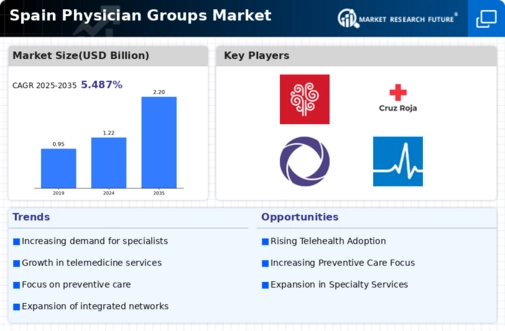The competitive dynamics within the Spain physician groups market are characterized by a blend of innovation, strategic partnerships, and regional expansion. Key players such as Quirónsalud (ES), Sanitas (ES), and Grupo Hospitalario HLA (ES) are at the forefront, each adopting distinct operational focuses that shape the market landscape. Quirónsalud (ES) emphasizes digital transformation, integrating advanced technologies into patient care, while Sanitas (ES) has been actively pursuing partnerships to enhance service delivery. Grupo Hospitalario HLA (ES) appears to be concentrating on regional expansion, aiming to increase its footprint across Spain, which collectively influences the competitive environment by fostering a culture of innovation and responsiveness to patient needs.