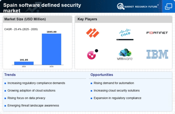 The evolving regulatory landscape in Spain is significantly influencing the software defined-security market. With the introduction of stringent data protection laws, organizations are increasingly required to comply with regulations such as the General Data Protection Regulation (GDPR). This has created a pressing need for software defined-security solutions that can assist in maintaining compliance and safeguarding sensitive information. Companies are investing in technologies that not only enhance security but also facilitate adherence to regulatory requirements. The software defined-security market is likely to see growth as businesses prioritize compliance-driven security measures. Furthermore, the potential for hefty fines for non-compliance is motivating organizations to adopt comprehensive security strategies, thereby driving demand for innovative software defined-security solutions.