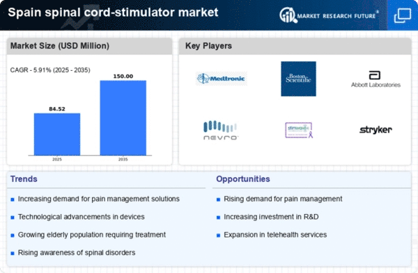 The rising incidence of chronic pain conditions in Spain is a primary driver for the spinal cord-stimulator market. Conditions such as neuropathic pain, fibromyalgia, and failed back surgery syndrome are becoming more prevalent, affecting a significant portion of the population. According to recent health statistics, approximately 20% of adults in Spain experience chronic pain, which necessitates effective pain management solutions. This growing patient population is likely to increase the demand for spinal cord stimulators, as they offer a viable alternative to traditional pain relief methods. The spinal cord-stimulator market is expected to expand as healthcare providers seek innovative solutions to address the needs of these patients, thereby enhancing their quality of life and reducing reliance on opioid medications.
