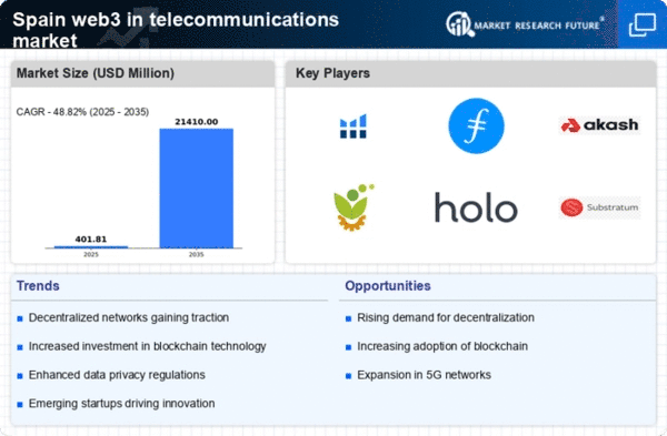 The web3 in-telecommunications market in Spain is experiencing a notable surge for decentralized services. This shift is largely driven by consumers' growing awareness of data privacy and security concerns. As individuals become more conscious of their digital footprints, they are gravitating towards solutions that offer enhanced control over personal information. Reports indicate that approximately 65% of Spanish consumers express a preference for services that utilize decentralized technologies. This trend is prompting telecommunications providers to explore innovative offerings that align with consumer expectations, fostering a more competitive landscape. The integration of decentralized services is likely to reshape traditional business models, compelling companies to adapt to the evolving market dynamics.