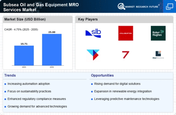 The Subsea Oil and Gas Equipment MRO Services Market is characterized by a competitive landscape that is increasingly shaped by technological advancements and strategic collaborations. Key players such as Schlumberger (US), Halliburton (US), and TechnipFMC (GB) are actively pursuing innovation and digital transformation to enhance operational efficiency and service delivery. Schlumberger (US) has focused on integrating advanced data analytics into its maintenance operations, which appears to streamline processes and reduce downtime for clients. Meanwhile, Halliburton (US) has emphasized regional expansion, particularly in emerging markets, to capitalize on the growing demand for subsea services. TechnipFMC (GB) has adopted a strategy centered around sustainability, aiming to reduce the environmental impact of its operations, which resonates well with current market trends.The business tactics employed by these companies reflect a concerted effort to optimize supply chains and localize manufacturing. The market structure is moderately fragmented, with several players vying for market share, yet the influence of major companies remains substantial. This competitive dynamic fosters an environment where innovation and operational excellence are paramount, as companies seek to differentiate themselves in a crowded marketplace.