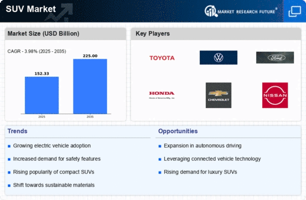 North America continues to lead The suv market, holding a significant share of 58.0% as of December 2025. The region's growth is driven by increasing consumer preference for larger vehicles, coupled with advancements in fuel efficiency and safety features. Regulatory support for electric and hybrid SUVs is also a key catalyst, encouraging manufacturers to innovate and meet evolving consumer demands. The competitive landscape is robust, with major players like Ford, Chevrolet, and Toyota dominating the market. The U.S. remains the largest market, supported by a strong infrastructure for SUV sales and a growing trend towards family-oriented vehicles. The presence of established brands and new entrants is intensifying competition, ensuring a dynamic market environment.