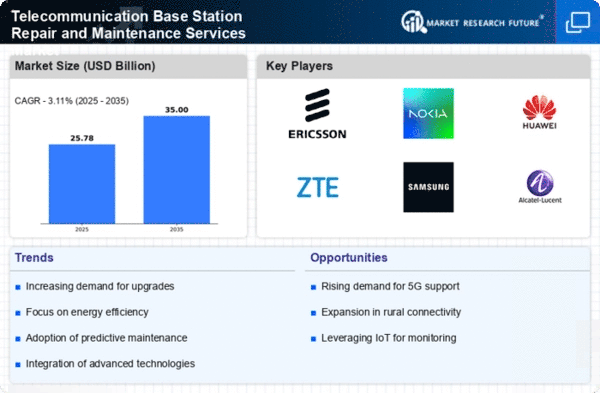 The Telecommunication Base Station Repair and Maintenance Services Market is characterized by a dynamic competitive landscape, driven by the increasing demand for reliable connectivity and the rapid evolution of telecommunications technology. Key players such as Ericsson (SE), Nokia (FI), and Huawei (CN) are at the forefront, each adopting distinct strategies to enhance their market positioning. Ericsson (SE) focuses on innovation and digital transformation, investing heavily in next-generation technologies to streamline operations and improve service delivery. Meanwhile, Nokia (FI) emphasizes strategic partnerships and regional expansion, aiming to strengthen its global footprint and enhance service capabilities. Huawei (CN), on the other hand, leverages its extensive R&D capabilities to drive technological advancements, positioning itself as a leader in 5G infrastructure and maintenance services. Collectively, these strategies contribute to a competitive environment that is increasingly shaped by technological innovation and strategic collaborations.In terms of business tactics, companies are increasingly localizing manufacturing and optimizing supply chains to enhance operational efficiency. The market appears moderately fragmented, with several key players exerting significant influence. This structure allows for a diverse range of service offerings, catering to various customer needs while fostering competition among established and emerging players.