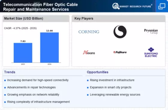 The Telecommunication Fiber Optic Cable Repair and Maintenance Services Market is currently characterized by a dynamic competitive landscape, driven by the increasing demand for high-speed internet and the expansion of telecommunications infrastructure globally. Key players such as Corning (US), Prysmian Group (IT), and Nexans (FR) are strategically positioned to leverage their technological expertise and extensive service networks. Corning (US) focuses on innovation in fiber optic technology, while Prysmian Group (IT) emphasizes mergers and acquisitions to enhance its service capabilities. Nexans (FR) is actively pursuing regional expansion, particularly in emerging markets, which collectively shapes a competitive environment that is both collaborative and competitive.