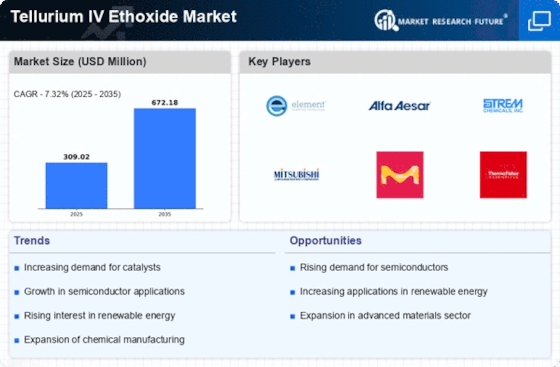 The Tellurium IV Ethoxide Market is likely to benefit from regulatory support aimed at promoting advanced materials. Governments are increasingly recognizing the importance of materials that contribute to sustainability and technological advancement. Policies encouraging the use of high-performance materials in manufacturing processes are emerging, which could bolster the demand for Tellurium IV Ethoxide Market. For instance, regulations aimed at reducing carbon emissions may incentivize the adoption of renewable energy technologies, where Tellurium IV Ethoxide Market is a key component. As regulatory frameworks evolve, the Tellurium IV Ethoxide Market may find itself in a favorable position, benefiting from both compliance requirements and incentives designed to foster innovation.