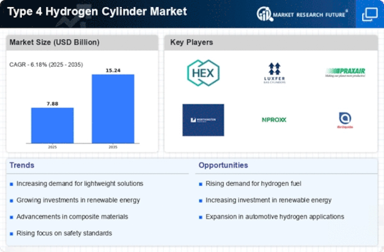 Technological innovations in cylinder manufacturing are reshaping the Type 4 Hydrogen Cylinder Market. Advances in composite materials and manufacturing techniques have led to the production of lighter, stronger, and more durable cylinders. These innovations not only enhance the performance of Type 4 cylinders but also reduce production costs, making them more accessible to various sectors. In 2025, the market for composite materials used in hydrogen storage is expected to grow significantly, driven by the demand for high-performance solutions. This evolution in manufacturing technology indicates a promising future for the Type 4 Hydrogen Cylinder Market, as companies seek to leverage these advancements to improve their product offerings and meet the needs of a diverse customer base.