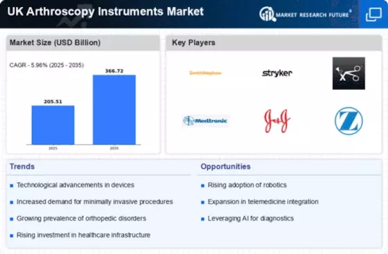 The UK Arthroscopy Instruments Market is experiencing growth due to the increasing prevalence of orthopedic disorders, such as osteoarthritis and sports-related injuries. According to the National Health Service (NHS), musculoskeletal disorders affect millions of individuals in the UK, leading to a higher demand for arthroscopic surgeries. This trend is likely to drive the adoption of advanced arthroscopy instruments, as healthcare providers seek to improve patient outcomes and reduce recovery times. The growing aging population, which is more susceptible to joint-related issues, further contributes to this demand. As a result, the UK Arthroscopy Instruments Market is poised for expansion, with manufacturers focusing on innovative solutions to cater to the needs of orthopedic surgeons and patients alike.