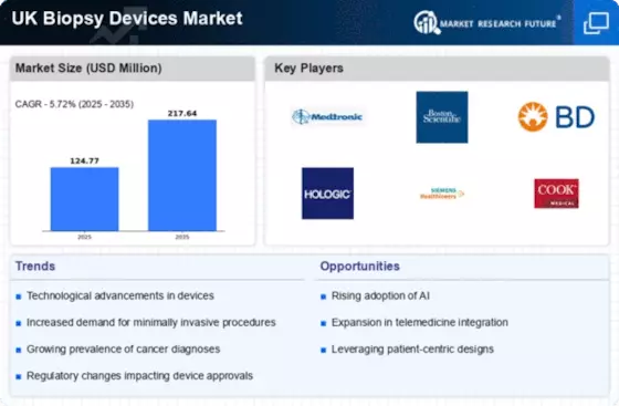 The UK Biopsy Devices Market is characterized by a competitive landscape that is increasingly shaped by innovation, strategic partnerships, and technological advancements. Key players such as Medtronic (GB), Boston Scientific (GB), and Hologic (GB) are at the forefront, each adopting distinct strategies to enhance their market presence. Medtronic (GB) focuses on integrating advanced imaging technologies into its biopsy devices, thereby improving diagnostic accuracy. Meanwhile, Boston Scientific (GB) emphasizes the development of minimally invasive procedures, which aligns with the growing demand for patient-centric healthcare solutions. Hologic (GB) is leveraging its expertise in women's health to expand its biopsy offerings, particularly in breast cancer diagnostics. Collectively, these strategies contribute to a dynamic competitive environment, where innovation and specialization are paramount.