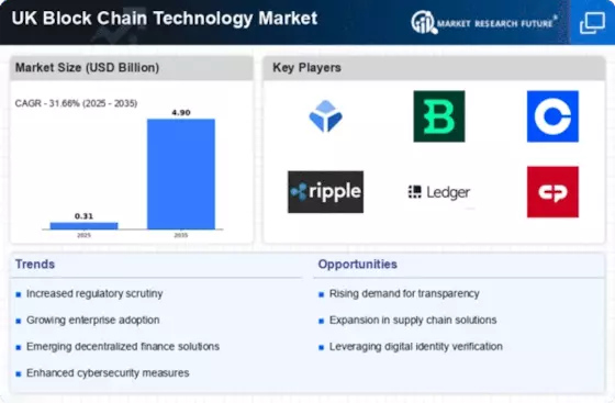 The UK Block Chain Technology Market is increasingly influenced by the need for compliance with regulatory standards and frameworks. As blockchain technology matures, regulatory bodies are developing guidelines to ensure its safe and effective use. The Financial Conduct Authority (FCA) has been actively working on establishing a regulatory framework that addresses the unique challenges posed by blockchain applications. This focus on compliance is encouraging businesses to adopt blockchain solutions that align with regulatory requirements, thereby fostering a more secure and trustworthy environment. As regulations evolve, the UK Block Chain Technology Market is likely to see a rise in adoption rates, as companies seek to navigate the complexities of compliance while leveraging the benefits of blockchain.