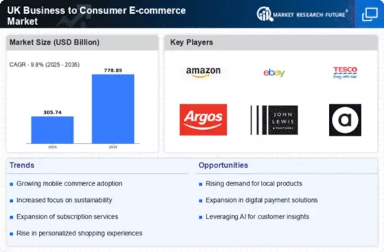 The UK Business To Consumer E Commerce Market is experiencing a notable shift towards diverse online payment solutions. The increasing adoption of digital wallets, such as PayPal and Apple Pay, has facilitated smoother transactions for consumers. In 2025, approximately 60% of online purchases in the UK were made using digital payment methods, indicating a strong preference for convenience and security. This trend is likely to continue, as consumers seek faster and more efficient ways to complete their purchases. Furthermore, the introduction of Buy Now, Pay Later (BNPL) services has provided consumers with flexible payment options, enhancing their shopping experience. As a result, businesses in the UK Business To Consumer E Commerce Market are adapting their payment systems to accommodate these preferences, which may lead to increased sales and customer loyalty.