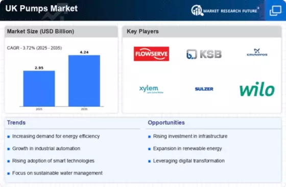 Infrastructure development remains a key driver for the UK Pumps Market. The UK government has committed substantial investments in infrastructure projects, including transportation, water supply, and energy generation. For instance, the National Infrastructure Strategy outlines plans for significant upgrades to water management systems, which directly impacts the demand for pumps. The UK Pumps Market is poised to benefit from these investments, as modernized infrastructure requires advanced pumping solutions to ensure efficient operation. With an estimated investment of over 600 billion GBP in infrastructure over the next decade, the market is likely to experience robust growth, driven by the need for reliable and efficient pumping systems.