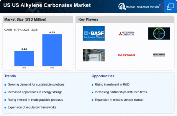 The US Alkylene Carbonates Market is bolstered by the expansion of end-use industries such as automotive, electronics, and pharmaceuticals. These sectors are increasingly utilizing alkylene carbonates due to their superior properties, including high solvency and low volatility. For instance, in the automotive industry, alkylene carbonates are employed in battery electrolytes, which are essential for electric vehicles. The growth of the electric vehicle market in the US, projected to reach millions of units by 2026, is likely to drive demand for alkylene carbonates. Furthermore, the electronics sector's reliance on these compounds for manufacturing processes further solidifies their importance in the market, indicating a robust growth trajectory.