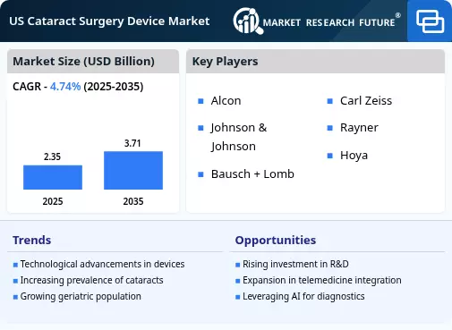 Technological advancements in cataract surgery devices are significantly influencing the US cataract surgery device market. Innovations such as femtosecond laser-assisted cataract surgery (FLACS) and advanced intraocular lenses (IOLs) have transformed surgical procedures, enhancing precision and patient outcomes. The market for IOLs alone is projected to reach approximately $4 billion by 2026, driven by the demand for premium lenses that offer better visual acuity. These innovations not only improve surgical efficiency but also reduce recovery times, making cataract surgery more appealing to patients. As technology continues to evolve, the US cataract surgery device market is expected to witness further growth, with manufacturers investing in research and development to stay competitive.