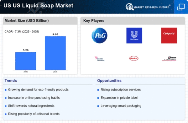 The US Liquid Soap Market is benefiting from the expansion of distribution channels, particularly in the e-commerce sector. With the rise of online shopping, consumers have greater access to a diverse range of liquid soap products. Data suggests that e-commerce sales of liquid soaps have increased by approximately 15% in the last year, reflecting a shift in consumer purchasing behavior. This trend is further supported by the convenience and variety that online platforms offer, allowing consumers to compare products and read reviews before making a purchase. As more consumers turn to online shopping, the US Liquid Soap Market is likely to see continued growth, as manufacturers adapt their strategies to capitalize on this trend.