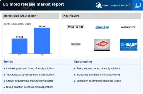 The mold release market exhibits a dynamic competitive landscape characterized by innovation and strategic partnerships. Key players such as Momentive Performance Materials Inc (US), Huntsman Corporation (US), and 3M Company (US) are actively shaping the market through their distinct operational focuses. Momentive Performance Materials Inc (US) emphasizes innovation in silicone-based release agents, which are increasingly favored for their efficiency and environmental compatibility. Huntsman Corporation (US) has adopted a strategy of regional expansion, particularly in North America, to enhance its market presence and cater to local demand. Meanwhile, 3M Company (US) is leveraging its extensive research capabilities to develop advanced mold release solutions that align with sustainability trends. Collectively, these strategies contribute to a competitive environment that prioritizes technological advancement and customer-centric solutions.In terms of business tactics, companies are increasingly localizing manufacturing to reduce lead times and optimize supply chains. The market structure appears moderately fragmented, with several players vying for market share while also collaborating on various initiatives. This fragmentation allows for a diverse range of products and services, catering to different segments of the mold release market. The collective influence of these key players fosters a competitive atmosphere where innovation and responsiveness to market needs are paramount.