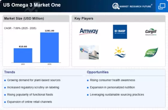 The Omega 3 Market One is currently characterized by a dynamic competitive landscape, driven by increasing consumer awareness regarding health benefits associated with Omega 3 fatty acids. Key players are actively engaging in strategies that emphasize innovation, sustainability, and digital transformation. For instance, in December 2025, BASF (US) announced a new initiative aimed at enhancing the sustainability of its Omega 3 production processes, which aligns with the growing consumer demand for environmentally friendly products. Similarly, Nordic Naturals (US) has focused on expanding its product line to include plant-based Omega 3 options, catering to the rising trend of veganism and plant-based diets. These strategic moves collectively shape a competitive environment that is increasingly focused on health-conscious and environmentally aware consumers.