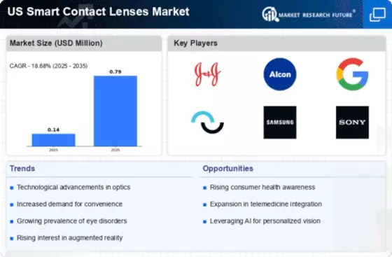 The US Smart Contact Lenses Market is experiencing rapid growth due to technological advancements. Innovations in materials and design have led to the development of lenses that can monitor health metrics, such as glucose levels for diabetic patients. The integration of sensors and microelectronics into contact lenses is becoming more prevalent, allowing for real-time data collection. According to recent estimates, the market for smart contact lenses is projected to reach USD 3 billion by 2027, driven by these technological innovations. Furthermore, advancements in augmented reality (AR) applications are likely to enhance user experience, making smart lenses more appealing to consumers. As technology continues to evolve, the potential for new functionalities in smart contact lenses may further stimulate market growth.