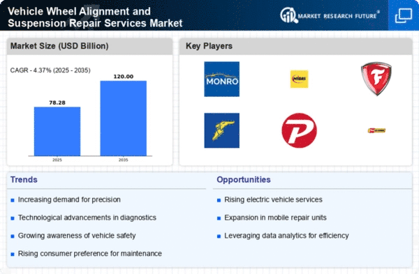 The Vehicle Wheel Alignment and Suspension Repair Services Market is characterized by a competitive landscape that is increasingly shaped by innovation, strategic partnerships, and a focus on customer-centric services. Key players such as Monro Inc (US), Midas Inc (US), and Firestone Complete Auto Care (US) are actively pursuing strategies that enhance their market positioning. Monro Inc (US) has been focusing on expanding its service offerings through technological advancements, which appears to be a response to the growing demand for precision in vehicle maintenance. Meanwhile, Midas Inc (US) emphasizes customer loyalty programs and service diversification, aiming to capture a broader customer base. Firestone Complete Auto Care (US) is leveraging its extensive network to enhance service accessibility, indicating a trend towards regional expansion that could reshape competitive dynamics.The market structure is moderately fragmented, with numerous players vying for market share. This fragmentation is influenced by local service providers and national chains alike, each employing tactics such as localized manufacturing and supply chain optimization to enhance operational efficiency. The collective influence of these key players suggests a competitive environment where agility and responsiveness to consumer needs are paramount.