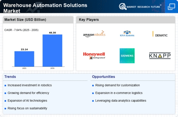The Warehouse Automation Solutions Market is characterized by a dynamic competitive landscape, driven by technological advancements and increasing demand for efficiency in logistics. Key players such as Amazon Robotics (US), Dematic (US), and Siemens (DE) are at the forefront, each adopting distinct strategies to enhance their market positioning. Amazon Robotics (US) continues to innovate with its autonomous mobile robots, focusing on improving warehouse efficiency and reducing operational costs. Meanwhile, Dematic (US) emphasizes its integration of AI and machine learning into its automation solutions, aiming to optimize supply chain processes. Siemens (DE) is strategically investing in digital transformation initiatives, enhancing its automation offerings through advanced software solutions, which collectively shape a competitive environment that prioritizes innovation and operational excellence.The business tactics employed by these companies reflect a concerted effort to localize manufacturing and optimize supply chains. The market appears moderately fragmented, with a mix of established players and emerging startups. This structure allows for a diverse range of solutions, catering to various customer needs. The collective influence of key players fosters a competitive atmosphere where technological advancements and customer-centric strategies are paramount.