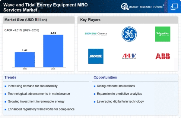 The Wave and Tidal Energy Equipment MRO Services Market is currently characterized by a dynamic competitive landscape, driven by the increasing demand for renewable energy solutions and the need for sustainable practices. Key players such as Siemens Gamesa Renewable Energy (ES), General Electric (US), and Schneider Electric (FR) are at the forefront, each adopting distinct strategies to enhance their market positioning. Siemens Gamesa Renewable Energy (ES) focuses on innovation and technological advancements, particularly in turbine efficiency, while General Electric (US) emphasizes strategic partnerships to expand its service offerings. Schneider Electric (FR) is leveraging digital transformation to optimize maintenance processes, thereby enhancing operational efficiency. Collectively, these strategies contribute to a competitive environment that is increasingly focused on sustainability and technological integration.The market structure appears moderately fragmented, with several players vying for market share. Key business tactics include localizing manufacturing to reduce costs and optimize supply chains, which is particularly relevant in the context of rising material costs and logistical challenges. The influence of major players is significant, as their operational strategies often set benchmarks for industry standards, thereby shaping the overall market dynamics.