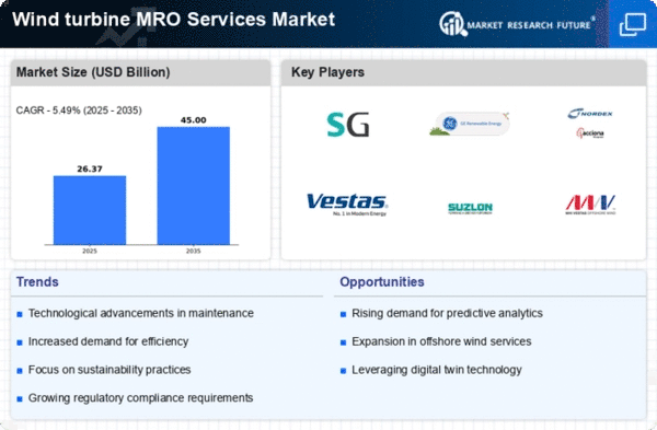 The Middle East and Africa region is gradually recognizing the potential of the Wind Turbine MRO Services Market, with a market size of $2.0 billion anticipated by 2025. The growth is driven by increasing investments in renewable energy projects and a shift towards sustainable energy solutions. Governments are beginning to implement policies that support the development of wind energy, creating a favorable environment for MRO services. Countries like South Africa and Morocco are at the forefront of this transition, with initiatives aimed at harnessing wind energy. The competitive landscape is still developing, with opportunities for both local and international players to establish a foothold. As the market evolves, the focus will be on building infrastructure and enhancing service delivery to meet growing energy demands.