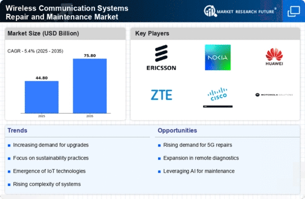 The increased focus on network reliability and performance is significantly impacting the Wireless Communication Systems Repair and Maintenance Market. As businesses and consumers rely more heavily on wireless communication for daily operations, the expectation for uninterrupted service has never been higher. In 2025, it is anticipated that the cost of network downtime could reach $1 trillion, underscoring the critical need for effective maintenance solutions. Organizations are prioritizing investments in repair and maintenance services to enhance their network performance and minimize disruptions. This trend creates a favorable environment for the Wireless Communication Systems Repair and Maintenance Market, as service providers are called upon to deliver solutions that ensure optimal network functionality and reliability.